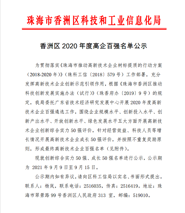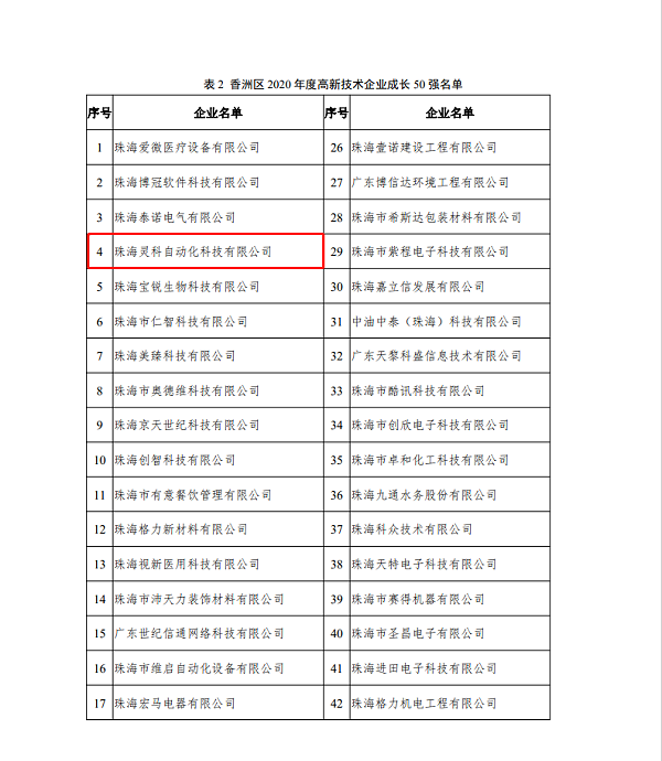 珠海市香洲區科技和工業信息化局發文公布《香洲區2020年度高企百強名單公示》。珠海靈科自動化科技有限公司(以下簡稱靈科超聲波)榮獲“香洲區2020年度高新技術企業成長50強”