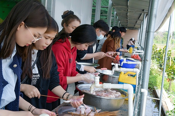 食材到達后齊刷刷上手,清洗食材,準備餐具,串肉上簽,扒蒜切菜再剁肉......靈科家人們在燒烤架前各顯神通。點火的,刷油的,調制調料的......燒烤現場繁忙而又井然有序。