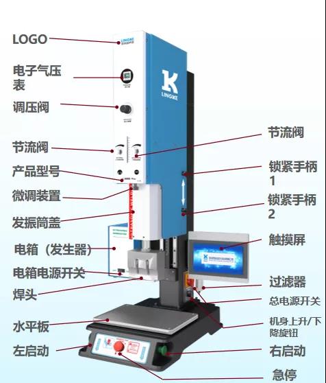 機身面板設有刻度尺,選用高頻換能器連接接頭,焊頭可360°旋轉對位,精準快速調模;焊頭行程100mm,(0-90mm)焊接行程可調節,適用產品焊接廣。
