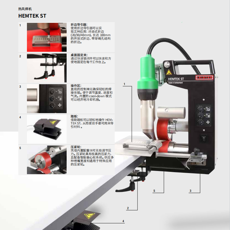 特點:焊接速度高達12 m/min;風機性能強勁,操作簡單;無需工具即可調(diào)節(jié)折邊導引器;焊接支持閉合式折邊、開放式折邊、帶穿繩孔結(jié)構(gòu);可調(diào)節(jié)所有焊接參數(shù),自由調(diào)節(jié)快速鎖閉件;